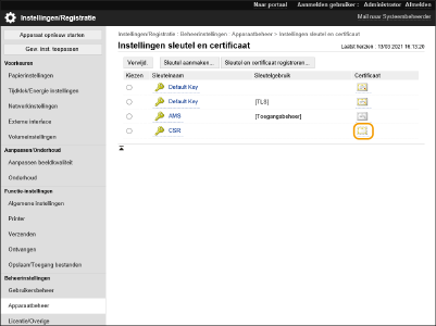 Certificaten die op deze machine worden gegenereerd, hebben geen CA-handtekening, waardoor communicatiefouten met sommige communicatie-evenknieën kunnen optreden. Om een certificaat met een CA-handtekening aan te vragen, zijn gegevens voor een certificaatondertekeningsverzoek (CSR) nodig. Een gebruiker die zich aanmeldt met beheerdersbevoegdheden, kan een CSR genereren.