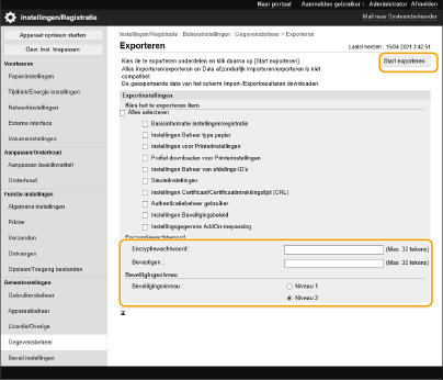 Als u alle instellingengegevens wilt versleutelen, selecteert u [Niveau 2] in [Beveiligingsniveau].