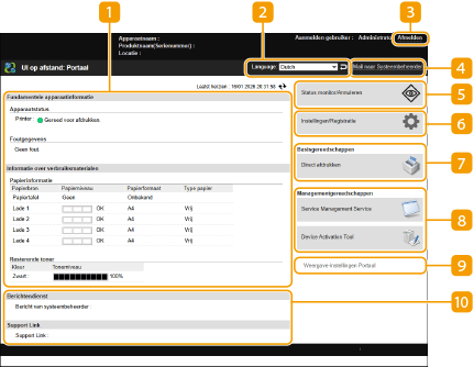 Sommige weergave-items en functies zijn alleen beschikbaar als u zich aanmeldt met beheerdersbevoegdheden. Als meerdere gebruikers de Remote UI (UI op afstand) gelijktijdig gebruiken of wanneer het bedieningspaneel van de machine tegelijk met de Remote UI (UI op afstand) wordt bediend, zal de laatste handeling die werd uitgevoerd, van kracht worden. |