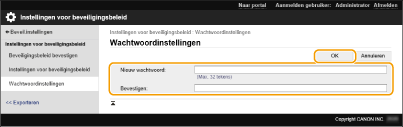 Voer het huidige wachtwoord in bij [Huidig wachtwoord:] en klik op [OK] zonder een waarde in te voeren voor [Nieuw wachtwoord:] of [Bevestigen:] (laat ze leeg). Als bij [Beleid voor wachtwoordinstellingen] beperkingen zijn ingesteld aan het aantal tekens, moet bij deze instelling een waarde worden ingevoerd. Annuleer eerst de limiet voordat u het wachtwoord verwijdert.