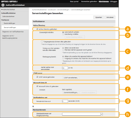 ![]() | Om een Active Directory-, Microsoft Entra ID- of LDAP-server als extra verificatieapparaat op te geven, moet u de gegevens van de server die voor verificatie worden gebruikt, registreren. Voer, indien nodig, een verbindingstest uit. |