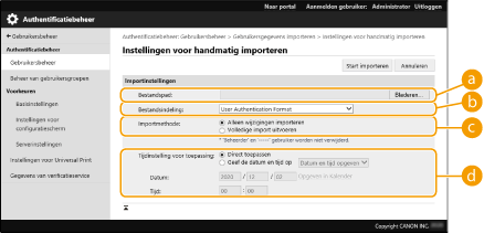 Importeert gebruikersgegevens die zijn gemaakt met de bestandsindeling die kan worden gebruikt bij Gebruikersverificatie. De bestandsextensie is "CSV".