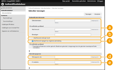 Schakel het selectievakje in om het wachtwoord van de te registreren gebruiker zodanig in te stellen dat er geen verloopdatum is. Deze instelling kan worden opgegeven wanneer [Stel geldigheidsperiode van wachtwoord in] is ingesteld op [Uit] in [Beleid voor wachtwoordinstellingen] in [Authentificatie] in [Instellingen voor beveiligingsbeleid].