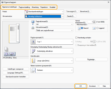 Selecteer het printerstuurprogramma voor deze machine en klik op [Voorkeursinstellingen] of [Eigenschappen].