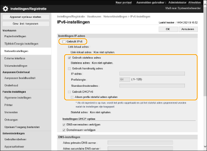 Schakel het selectievakje in om IPv6 op de machine in te schakelen. Als u geen IPv6 gebruikt, schakelt u het selectievakje uit.