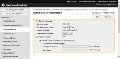 1 | Klik op [Administratorinstellingen]. [Gebruik beheerder] Selecteer het selectievakje om de beheerder-gebruiker te gebruiken. [Authentificatie algoritme] en [Encryptie algoritme] kunnen niet worden gewijzigd. [Gebruik zelfde wachtwoord als voor verificatie] Selecteer het selectievakje om hetzelfde wachtwoord te gebruiken als het wachtwoord dat bij de gebruikersauthenticatie wordt gebruikt. |