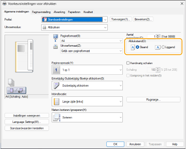 Stel in het scherm [Basisinstellingen] van het stuurprogramma [Afdrukstand] in op dezelfde oriëntatie als in stap 1.