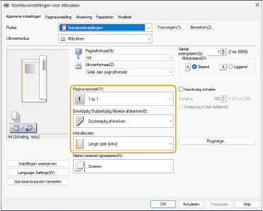 Stel tijdens het controleren van het afdrukvoorbeeld [Pagina-opmaak] [Paginavolgorde] [Enkelzijdig/Dubbelzijdig/Boekje afdrukken] [Inbindlocatie] in.