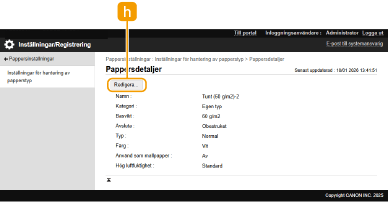Du måste logga in som administratör för att kunna registrera egna papperstyper eller ändra inställningarna för registrerade egna papperstyper. Logga in på maskinen När du registrerar en egen papperstyp, kan du inte välja papperskälla. För mer information om hur du registrerar papperskälla, se Ange pappersformat och typ i papperslådan. Du kan importera/exportera information om registrerad egen papperstyp och dela den med en annan Canon-maskin. Importera/exportera alla inställningar |