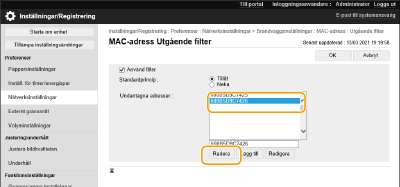 Om MAC-adressen har angetts felaktigt kan det hända att du inte kan komma åt maskinen via fjärranvändargränssnittet. I så fall måste du ställa in <Använd filter> på <Av> för <Utgående filter>/<Inkommande filter> i <MAC-adressfiltrering> på kontrollpanelen.