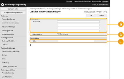Ange länken till supportinformation för maskinen som ska visas på portalsidan för Fjärranvändargränssnittet.