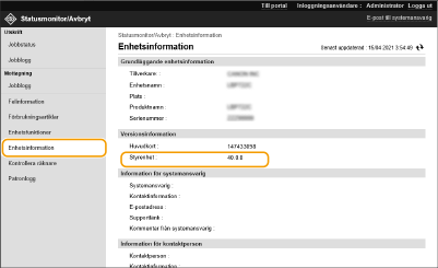 Klicka på [Enhetsinformation]  [Versionsinformation]  välj [Styrenhet].