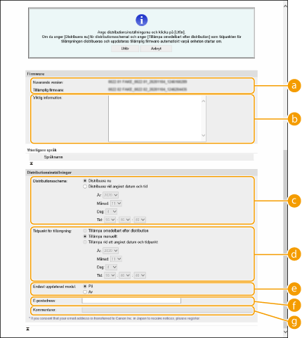 [Distributionsschema]Välj [Distribuera nu] för att ladda ned den fasta programvaran med en gång. För att automatiskt ladda ned den fasta programvaran vid ett angivet datum och klockslag, välj [Distribuera vid angivet datum och tid] och ange datum och tid i [År:]/[Månad:]/[Dag:]/[Tid:]. Du kan schemalägga en tid en vecka i förväg.