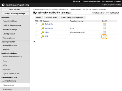 Nyckeln som genererade CSR visas på skärmen med nyckel- och certifikatlistan, men du kan inte använda det ensamt. För att använda den här nyckeln, måste du registrera det certifikat som senare utges baserat på CSR. Registrera ett certifikat till en nyckel |