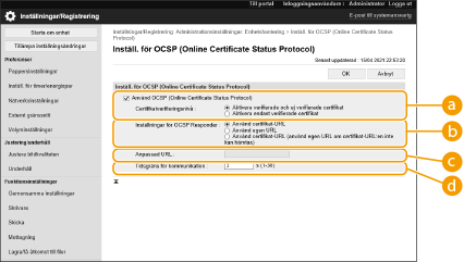När [Använd egen URL] eller [Använd certifikat-URL (använd egen URL om certifikat-URL:en inte kan hämtas)] har valts anger du webbadressen för OCSP-svararen (endast ASCII-kod, högst 255 tecken).
