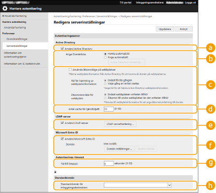 ![]() | För att ange en Active Directory-, Microsoft Entra ID- eller LDAP-server som en ytterligare autentiseringsenhet behöver du registrera informationen för den server som används för autentisering. Utför ett anslutningstest efter behov. |