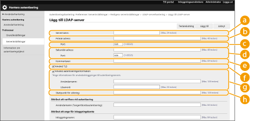 3 | Ange LDAP-serverinformation. ![]() [Servernamn]Ange namnet på LDAP-servern. Namnet "localhost" kan inte användas. Serverns namn får inte innehålla mellanslag. [Primär adress]Ange IP-adressen eller värdnamnet för LDAP-servern (Exempel: ldap.exempel.com). Loopback-adressen (127.0.0.1) kan inte användas. [Port:]Ange det portnummer som används för kommunikation med LDAP-servern. Använda samma inställning konfigurerats på servern. Om du inte anger ett nummer, anges automatiskt "636" om kryssrutan har markerats för [Använd TLS], eller till "389" om kryssrutan har avmarkerats. [Sekundär adress:] / [Port:]När du använder en sekundär server i din miljö, anger du IP-adress och portnummer. [Kommentarer]Ange en beskrivning eller kommentar efter behov. [Använd TLS]Markera kryssrutan när du använder TLS-kryptering för kommunikation med LDAP-servern. [Använd autentiseringsinformation]Avmarkera kryssrutan för att tillåta anonym åtkomst till LDAP-servern, bara om LDAP-servern har ställts in för att tillåta anonym åtkomst. När du använder användarnamn och lösenord för autentisering, markerar du kryssrutan och anger värden för [Användarnamn:] och [Lösenord:]. ![]() Om den här kryssrutan är markerad och du vill ändra inställningarna i [Primär adress] eller [Sekundär adress:] för en LDAP-server krävs det att det lösenord som specificeras i [Lösenord:] anges i [Använd autentiseringsinformation]. [Startpunkt för sökning:]Ange platsen (nivån) för att söka efter användarinformation när LDAP-serverautentisering utförs. |