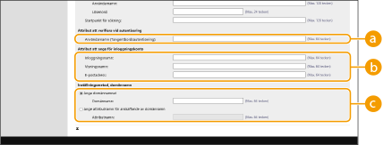 4 | Ange hur du vill ange attributnamn och domännamn. ![]() [Användarnamn (Tangentbordsautentisering):]Ange LDAP-datafält (attributnamn) för användarnamn på LDAP-servern (Exempel: uid). [Inloggningsnamn:] / [Visningsnamn:] / [E-postadress:]Ange LDAP-datafält (attributnamn) för inloggningsnamn, visningsnamn och e-postadress för varje användarkonto på LDAP-servern (Exempel: uid, cn, e-post). [Ange domännamnet] / [Ange attributnamn för anskaffande av domännamn]Välj hur du vill ange domännamnet för inloggningsdestinationen. För att ange domännamnet direkt, välj [Ange domännamnet] och skriv domännamnet. För att ange ett LDAP-datafält (attributnamn) från vilket domännamnet ska hämtas på LDAP-servern, välj [Ange attributnamn för anskaffande av domännamn] och ange attributnamnet (Exempel: dc). |