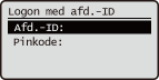 Når Administration af afdelings-ID ikke er implementeretNår der kun er indstillet systemadministrator-ID og pinkode uden Administration af afdelings-ID, skal du kun logge på maskinen, når du vil konfigurere de indstillinger, der kræver administratorrettigheder. Indtast ID og pinkode i <Systemadministrator-ID> og <Systemmanager-PIN>, og tryk på . |