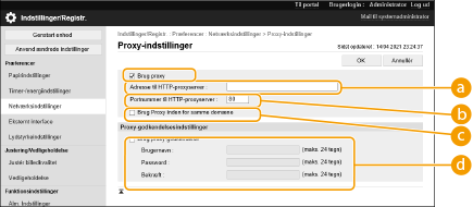 [Brug proxy-godkendelse]For at anvende godkendelsesfunktionen på en proxy-server skal du vælge flueben i dette afkrydsningsfelt og indtaste brugernavnet for godkendelse i [Brugernavn] og den nye adgangskode, der skal indstilles, i [Password] ved hjælp af alfanumeriske tegn.