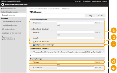 Markér afkrydsningsfeltet, for at angive, at adgangskoden til brugeren skal være uden udløbsdato. Denne indstilling kan angives, når [Indstil passwordets gyldighedsperiode] er indstillet til [Fra] i [Politik for adgangskodeindstillinger] i [Godkendelse] i [Indstillinger for sikkerhedspolitik].
