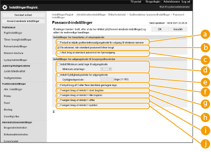 Indstillingerne i til gælder ikke for administration af afdelings-ID og PIN-koder. De er gyldige for adgangskoder, der er registreret/redigeret efter, at begrænsningerne er indstillet. Når en adgangskode, der allerede er registreret, overskrider begrænsningerne for disse indstillinger, vises en skærm, der beder om ændring af adgangskoden, når brugergodkendelsen udføres.