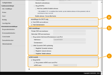 2 | Konfigurér DNS-indstillinger for IPv4. ![]() [Indstillinger for DHCP-valg][Hent værtsnavn] Vælg flueben i afkrydsningsfeltet for at aktivere Tilvalg 12 og rekvirere værtsnavnet fra DHCP-serveren. [Udfør Dynamisk DNS-opdatering] Sæt flueben i afkrydsningsfeltet for at aktivere Tilvalg 81 og opdatere DNS-optegnelserne dynamisk gennem DHCP-serveren. [Hent DNS-serveradresse] Vælg flueben i afkrydsningsfeltet for at aktivere Tilvalg 6 og rekvirere en DNS-serveradresse fra DHCP-serveren. [Hent domænenavn] Vælg flueben i afkrydsningsfeltet for at aktivere Tilvalg 15 og rekvirere et domænenavn fra DHCP-serveren. [Hent POP-serveradresse] Vælg flueben i afkrydsningsfeltet for at aktivere Tilvalg 70 og rekvirere en POP-serveradresse fra DHCP-serveren. [Frigiv adresser, der sidst blev hentet fra DHCP-serveren, når adressen ikke kan hentes] Fjern fluebenet i afkrydsningsfeltet for at anvende den manuelt indtastede IP-adresse, når automatisk rekvirering af IP-adresse mislykkes. [DNS-indstillinger][Primær DNS-serveradresse] Indtast IP-adressen på en DNS-server. [Sekundær DNS-serveradresse] Indtast IP-adressen på en sekundær DNS-server, hvis der er én. [Værtsnavn] Indtast alfanumeriske tegn for værtsnavnet for maskinen, der skal registreres på DNS-serveren. [Domænenavn] Indtast alfanumeriske tegn for navnet på det domæne, som maskinen tilhører, såsom ”eksempel.com”. [Udfør Dynamisk DNS-opdatering] Vælg flueben i afkrydsningsfeltet for dynamisk at opdatere DNS-optegnelserne, hver gang maskinens IP-adresse ændres. [mDNS-indstill.][Brug mDNS] mDNS (multicast-DNS) er en protokol til tilknytning af værtsnavn til en IP-adresse uden anvendelse af DNS, der anvendes af Bonjour. Vælg flueben i afkrydsningsfeltet for at aktivere mDNS, og indtast mDNS-navnet i tekstboksen [mDNS-navn]. |