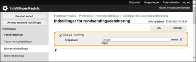 Vælg flueben i afkrydsningsfeltet for at indstille maskinen til at reagere på multicast-opdagelsespakker med software til enhedsadministration og aktivere overvågning ved hjælp af software til enhedsadministration.