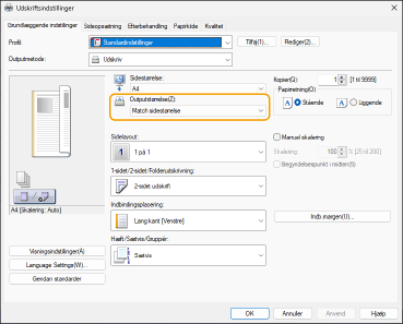 Match [Outputformat] i printerdriveren med formatet på det papir, der skal printes på.