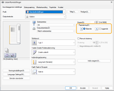 2 | På driverens [Grundlæggende indstillinger]-skærm skal du indstille [Papirretning] til den samme retning, som du har angivet i trin 1. |