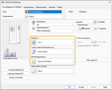 3 | Når du tjekker sideudskriften, kan du indstille [Sidelayout] [Siderækkefølge] [1-sidet/2-sidet/Folderudskrivning] [Indbindingsplacering]. |