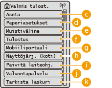 <Toiminnon asetukset>, <Yleisasetukset> ja monet muut laitteen asetukset aloitetaan tällä painikkeella.