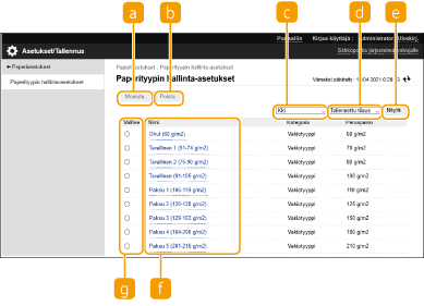 Vain paperityyppejä, joissa [Muokattu tyyppi] näkyy kohdassa [Kategoria], voidaan muokata.