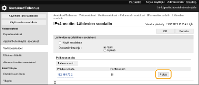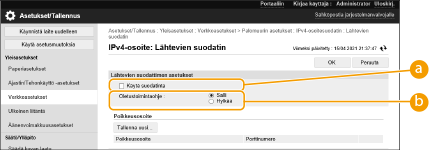 Jos IP-osoitteet on syötetty väärin, et välttämättä pääse laitteelle etäkäyttöliittymästä, jolloin sinun on valittava kohdan <IPv4-osoitesuodatin> tai <IPv6-osoitesuodatin> asetukseksi <Ei>.
