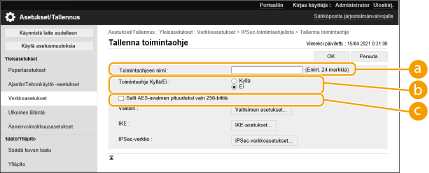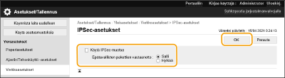 Voit myös ottaa käyttöön tai poistaa käytöstä IPSec-tietoliikenteen <Päävalikko>-näkymän kohdassa <Aseta>. <IPSec-asetukset>