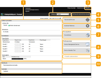 Jotkut näytön nimikkeistä ja toiminnoista ovat käytettävissä vain jos kirjaudut Pääkäyttäjän oikeuksin. Jos usea käyttäjä käyttää Remote UI (Etäkäyttöliittymä) -sovellusta samaan aikaan tai laitteen käyttöpaneelia käytetään samaan aikaan Remote UI (Etäkäyttöliittymä) -sovelluksen käytön kanssa, viimeisin suoritettu toiminto on voimassa. |