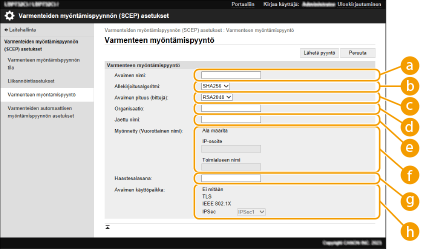 Laitteella luoduille avaimille vaadittavan varmenteen myöntämispyyntö voidaan lähettää SCEP (Simple Certificate Enrollment Protocol) -palvelimelle, joka hallinnoi varmenteita. SCEP-palvelimen myöntämät varmenteet rekisteröidään laitteeseen automaattisesti. Varmenteen myöntämispyynnön lähettämiseen vaaditaan Administrator-käyttöoikeudet.