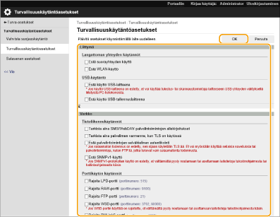 Kaikkien niiden laiteasetusten, jotka vaihdettiin, kun suojauskäytännön asetukset otettiin käyttöön, aiemmin asetettuja arvoja ei voi palauttaa vain tyhjentämällä valintamerkit. Vaihda asetukset käyttämällä <Aseta>-toimintoa tai etäkäyttöliittymää.