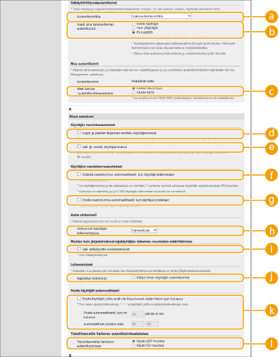 Määritä käyttäjän kirjautumismenetelmät (Kirjautumismenetelmä) ja todennuslaitteet (Todennuslaite). Huomaa että autentikointilaitteet on asennettava ennen seuraavien asetusten koostamista.
