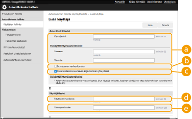 Merkitse valintaruutu, kun haluat, että käyttäjän tallentamalla salasanalla ei ole vanhenemispäivää. Tämä toiminto voidaan asettaa jos [Aseta salasanan voimassaoloaika] -asetuksena on [Ei] kohdassa [Salasana-asetusten käytännöt] kohdassa [Autentikointi] kohdassa [Turvallisuuskäytäntöasetukset].