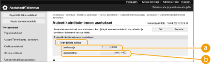 Jos haluat, että käyttäjiä pyydetään vaihtamaan salasanansa säännöllisesti, rastita tämä valintaruutu ja määrittele ajanjakso kohdassa [Voimassaoloaika].