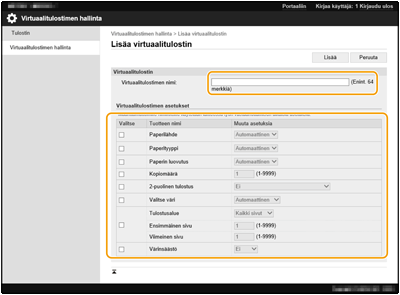 ![]() | Virtuaalitulostimen avulla voit käyttää LPD- tai FTP-tulostusta tallentamalla tulostusasetukset virtuaalitulostimeksi etukäteen. Esimerkiksi kun tallennat paperityypin, kopioiden määrä ja kaksipuolisen tulostuksen etukäteen, näitä asetuksia ei tarvitse määrittää erikseen joka työlle. |