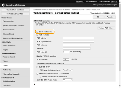 Ota sähköpostitulostus POP-postipalvelimelta käyttöön rastittamalla valintaruutu. Voit määritellä tämän asetuksen myös käyttämällä ohjauspaneelin asetusvalikon <Käytä POP-V.O> -toimintoa.