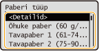 Paberi tüübi üksikasjalike seadistuse kontrollimiseks valige <Detailid>