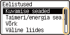 Saate muuta erinevaid kuvaga seotud sätteid, näiteks kuvamiskeel: <Kuvamise seaded> Saate muuta ekraani, mis kuvatakse automaatselt, kui seade jääb teatud aja jooksul jõudeolekusse: <Funktsioon pärast automaatset lähtestust> Saate muuta erinevaid juurdepääsuga seotud sätteid, näiteks kerimise kiirus: <Juurdepääs> |