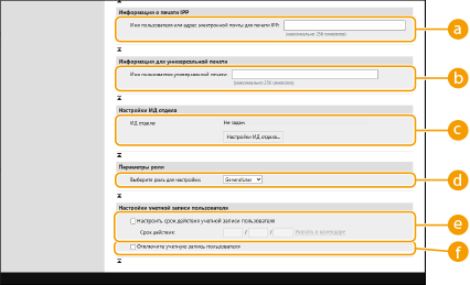 [ИД отдела:]Если используется управление ИД отдела, необходимо нажать кнопку [Настройки ИД отдела...] и выбрать из списка ИД отдела, который следует присвоить пользователю. Сначала зарегистрируйте необходимые ИД отдела в разделе [Регистрация нового отдела...] на экране списков. Если указанный здесь ИД отдела будет в дальнейшем удален, обязательно измените этот параметр.
