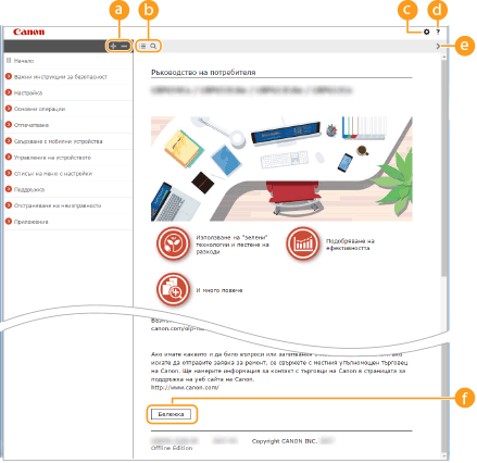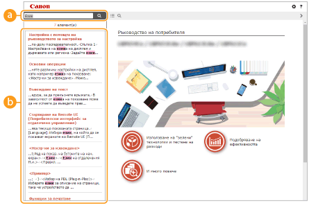 Щракнете върху тази икона, за да се изведе информация как да преглеждате Ръководство на потребителя, как да търсите и др.