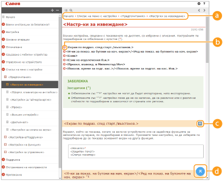 Щракнете, за да зададете настройки като размера на текста, оформлението и метода на показване за Ръководство на потребителя.