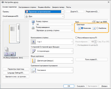 2 | На екрані [Basic Settings] драйвера встановіть для параметра [Орієнтація] таке саме значення орієнтації, що було встановлено під час кроку 1. |