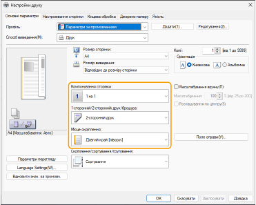 3 | Під час попереднього перегляду друку встановіть параметри [Компонування сторінки] [Порядок розташування сторінок] [1-сторонній/2-сторонній друк/брошура] [Місце скріплення]. |